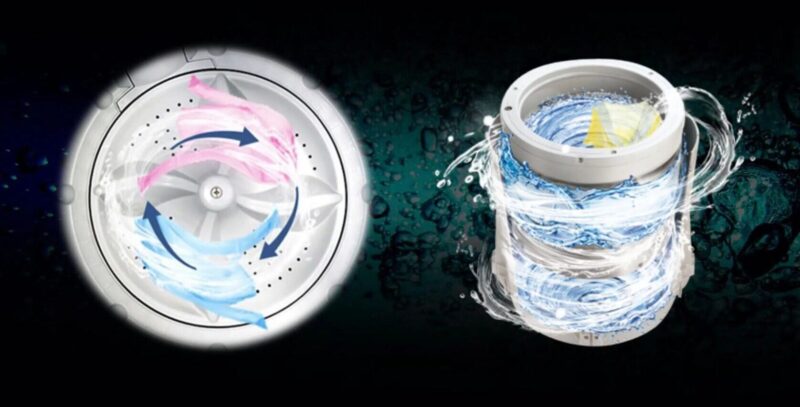 Mâm giặt trên dòng máy giặt TCL lồng đứng tạo nên dòng nước đa chiều mạnh mẽ, xoáy sâu và đánh tan các vết bẩn cứng đầu nhất trong quá trình giặt, cùng với thiết kế lồng giặt lớn hơn giúp quần áo ít bị xoắn rối vào nhau mang đến hiệu quả giặt tối ưu.