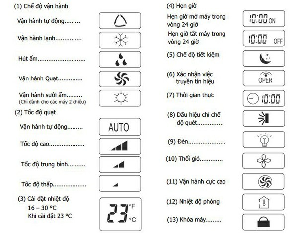 1. Bạn ấn vào nút MODE trê điều khiển để khởi động chế độ vận hành tự động2.Bạn ấn vào nút SPEED để điều chỉnh các chế độ như: LOW,MID,HIGH,AUTO3.ON/OFF là chế độ bật tắt điều hòa, Bấm 1 lần ON là bật máy, bấm thêm lần nữa OFF là tắt máy điều hòa.