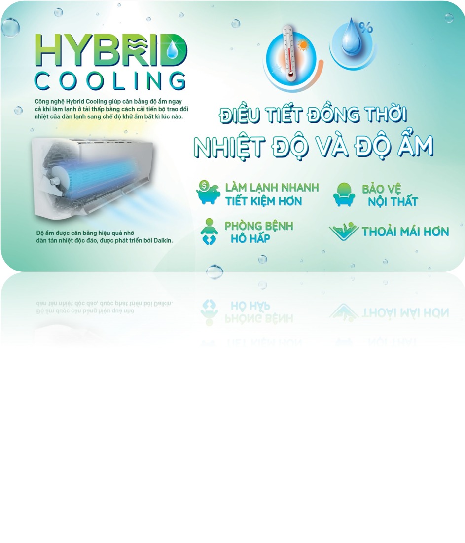 Chức năng Hybird Cooling trang bị trên điều hòa Daikin : chức năng điều tiết đồng thời độ ẩm và nhiệt độ , Hybrid Cooling giúp kiểm soát đồng thời nhiệt độ và độ ẩm mang lại sự thoải mái tối đa, ngăn ngừa sự phát triển của nấm mốc, vi khuẩn, hạn chế các bệnh về hô hấp, bảo vệ nội thất trong gia đình và giảm tiêu hao năng lượng. Với công nghệ Hybrid Cooling, độ ẩm luôn được duy trì ở mức 55% – 65%.