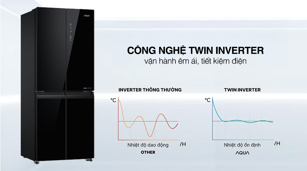 Nổi bật ở mẫu tủ lạnh này là khả năng tiết kiệm điện nhờ khả năng tiết kiệm điện. Tủ lạnh Aqua AQR-M466XA(GB) được trang bị công nghệ Twin Inverter là sự kết hợp của máy nén và quạt gió Inverter, giúp tủ hoạt động êm ái, tiết kiệm điện năng. Nhờ đó người dùng có thể yên tâm sử dụng mà không phải quá lo lắng về hóa đơn tiền điện hàng tháng.