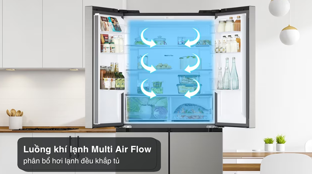 Không chỉ nổi bật với khả năng tiết kiệm điện, tủ lạnh LG LFB47SVM 474 Lít còn có khả năng bảo quản thực phẩm hiệu quả. Tủ lạnh sử dụng hệ thống làm lạnh đa chiều Multi Air Flow duy trì mức nhiệt ổn định cho cả 2 ngăn, đảm bảo độ tươi của thực phẩm. Thêm vào đó, ngăn chuyển đổi Fresh Switch cho phép điều chỉnh nhiệt độ linh hoạt, đáp ứng nhu cầu bảo quản đồng thời tối ưu hóa không gian sử dụng, tăng hiệu quả lưu trữ.