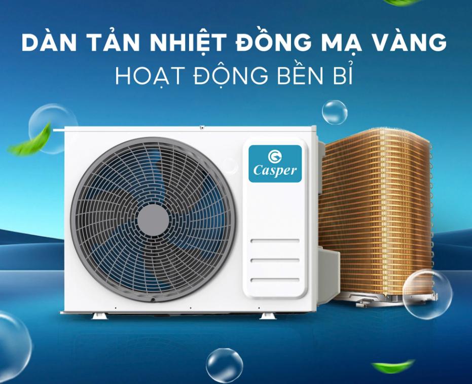 Không chỉ chú trọng hiệu suất và tiết kiệm điện, điều hòa Casper GC-24IS35 còn được đánh giá cao về độ bền vượt trội. Sản phẩm sử dụng ống dẫn gas bằng đồng mạ vàng kết hợp với lá tản nhiệt bằng nhôm mạ vàng, giúp tăng khả năng chống ăn mòn hiệu quả trước các tác động của môi trường như độ ẩm, mưa axit hay không khí muối. Bên cạnh việc gia tăng độ bền, lớp mạ vàng còn hỗ trợ nâng cao hiệu quả trao đổi nhiệt, giúp máy vận hành tối ưu hơn. Nhờ đó, người dùng không chỉ sở hữu một thiết bị làm mát mạnh mẽ mà còn tiết kiệm chi phí sửa chữa, bảo trì trong suốt quá trình sử dụng.