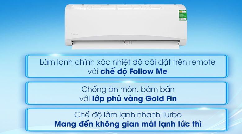 Điều hòa Midea MSMAIII-10CRDN1 là sản phẩm đáng mua nhất phân khúc công suất 9000BTU 1 chiều Inverter vì thiết kế hiện đại và được trang bị nhiều tính năng : làm lạnh nhanh , Góc thổi gió rộng – chế độ thổi gió 3 chiều , tính năng iECO tiết kiệm năng lượng , cảm biến thông minh , tính năng Follow me , loại bỏ bụi và vi khuẩn , lưới lọc kép , dàn tản nhiệt công nghệ mạ vàng….mà giá chỉ 5.490.000đ kèm miễn phí công lắp đặt tại Điện Máy Thuận Thành.