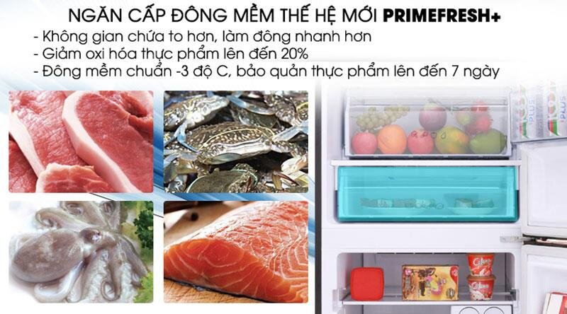 Tiếp theo đó là ngăn đông Prime Fresh sẽ giúp cho nhiệt độ ở mức -3 độ C mà không làm cho thịt cá đông đá, bảo quản được trong suốt 7 ngày giúp bạn không phải rã đông nữa khá tiện lợi.