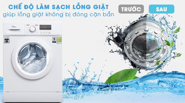 Máy giặt Midea lồng ngang MFD90-1208 với chế độ vệ sinh lồng giặt sẽ quay với tốc độ cao hơn bình thường, đẩy nước sạch lên giúp làm sạch vết bẩn bám trên lồng giặt như bụi bẩn, xơ vải và các loại vi khuẩn.