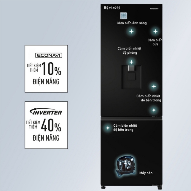 Bên cạnh đó, cảm biến Econavi thông minh giúp nhận biết nhiệt độ, tần suất mở cửa và lượng thực phẩm bên trong để điều chỉnh công suất làm lạnh hợp lý. Nhờ đó, tủ luôn duy trì độ lạnh tối ưu mà vẫn giảm thiểu lãng phí điện năng. Đây là một trong những ưu điểm nổi bật khiến Panasonic NR-BV361GPKV trở thành lựa chọn lý tưởng cho những ai chú trọng đến khả năng tiết kiệm năng lượng và vận hành bền lâu.