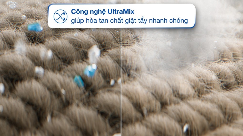 Bên cạnh đó, máy giặt còn được trang bị công nghệ UltraMix có khả năng hòa tan chất giặt tẩy và chất làm mềm vải, sẵn sàng phát huy đầy đủ tác dụng trước khi đi vào lồng giặt, đảm bảo quần áo được giặt sạch mà không dính vết cặn chất giặt tẩy. Thêm vào đó, máy còn sở hữu công nghệ giặt nhanh FullWash 45 với khả năng giặt tối đa tải trọng nhờ sử dụng các vòi phun nước mạnh mẽ kết hợp với chuyển động lốc xoáy đặc biệt ở nhiệt độ thấp 30oC, giúp cho quần áo được giặt sạch tối ưu chỉ trong 45 phút.