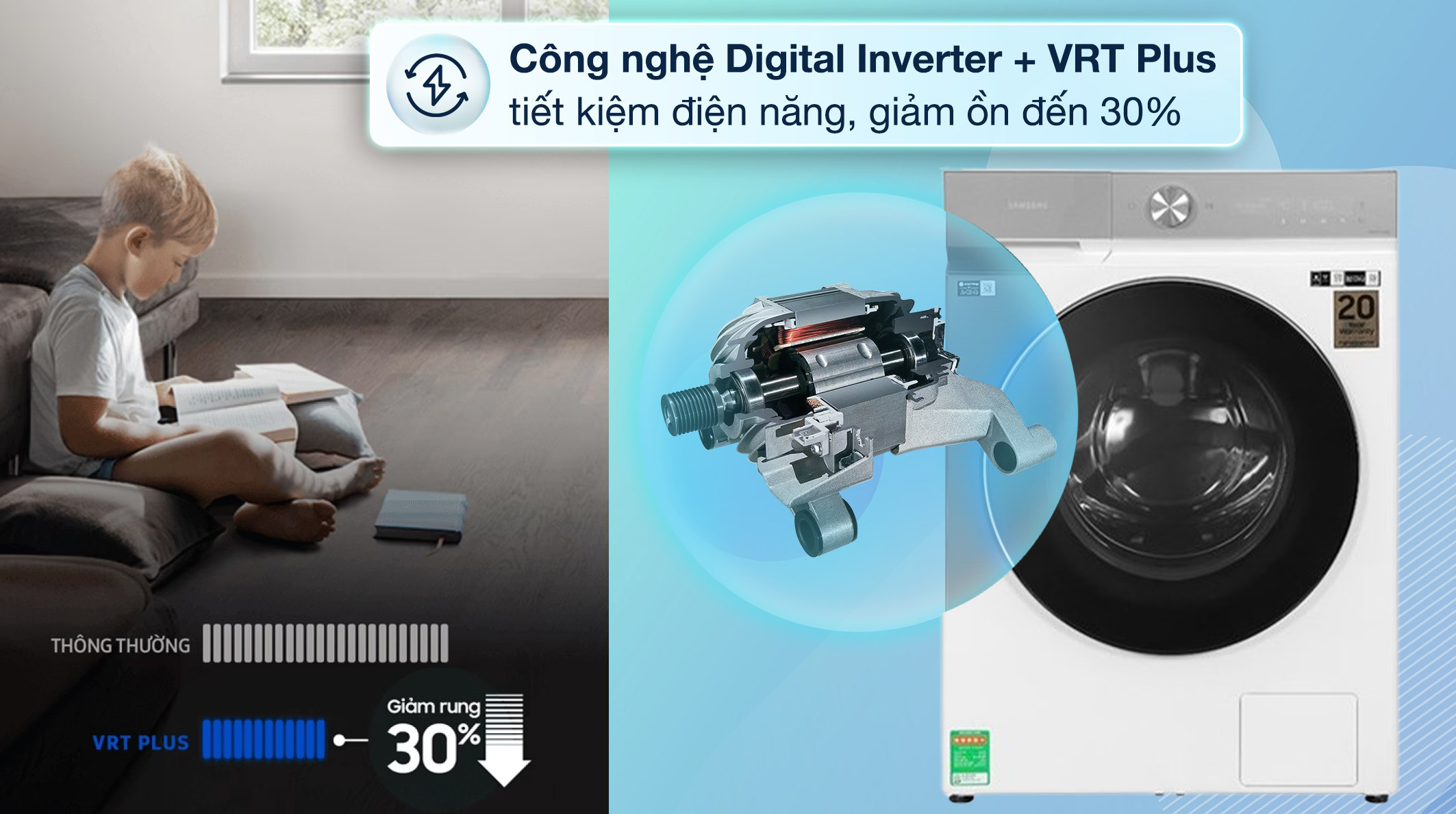 Không chỉ tiết kiệm điện, máy giặt còn được trang bị công nghệ VRT Plus tối ưu hiệu quả vận động của động cơ, hỗ trợ giảm tiếng ồn, chống rung đến 30% trong quá trình giặt. Giúp người dùng có thể giặt giũ quần áo bất kể lúc nào mà không sợ làm ảnh hưởng đến sinh hoạt của các thành viên trong gia đình.