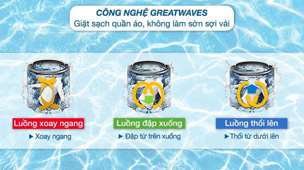 Một trong những công nghệ nổi bật giúp Toshiba AW-DM1100PV(KK) ghi điểm trong mắt người tiêu dùng chính là GreatWaves – công nghệ giặt tạo sóng siêu mạnh. Công nghệ này mô phỏng chuyển động sóng nước tự nhiên, giúp tăng cường khả năng hòa tan bột giặt, đánh bật vết bẩn nhanh hơn, đồng thời bảo vệ sợi vải không bị xơ, nhăn hay hư hỏng. Nhờ vậy, quần áo sau khi giặt không chỉ sạch sẽ mà còn giữ được màu sắc tươi mới và độ bền lâu hơn.