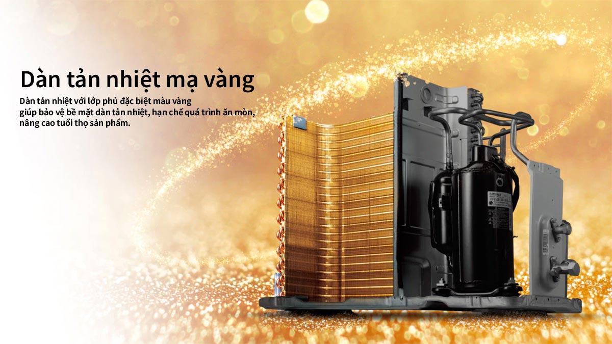 Bên cạnh hiệu suất và khả năng tiết kiệm điện, độ bền cũng là yếu tố quan trọng khi lựa chọn điều hòa. Điều hòa LG IDC12M1 được trang bị ống dẫn gas bằng đồng, giúp tăng khả năng dẫn nhiệt, nâng cao hiệu suất làm lạnh và kéo dài tuổi thọ sản phẩm. Ngoài ra, dàn tản nhiệt của máy được phủ lớp Gold-Fin chống ăn mòn hiệu quả. Lớp phủ này giúp bảo vệ bề mặt kim loại khỏi tác động của môi trường như hơi ẩm, nước mưa hay không khí chứa muối, đặc biệt phù hợp với điều kiện khí hậu nóng ẩm tại Việt Nam.