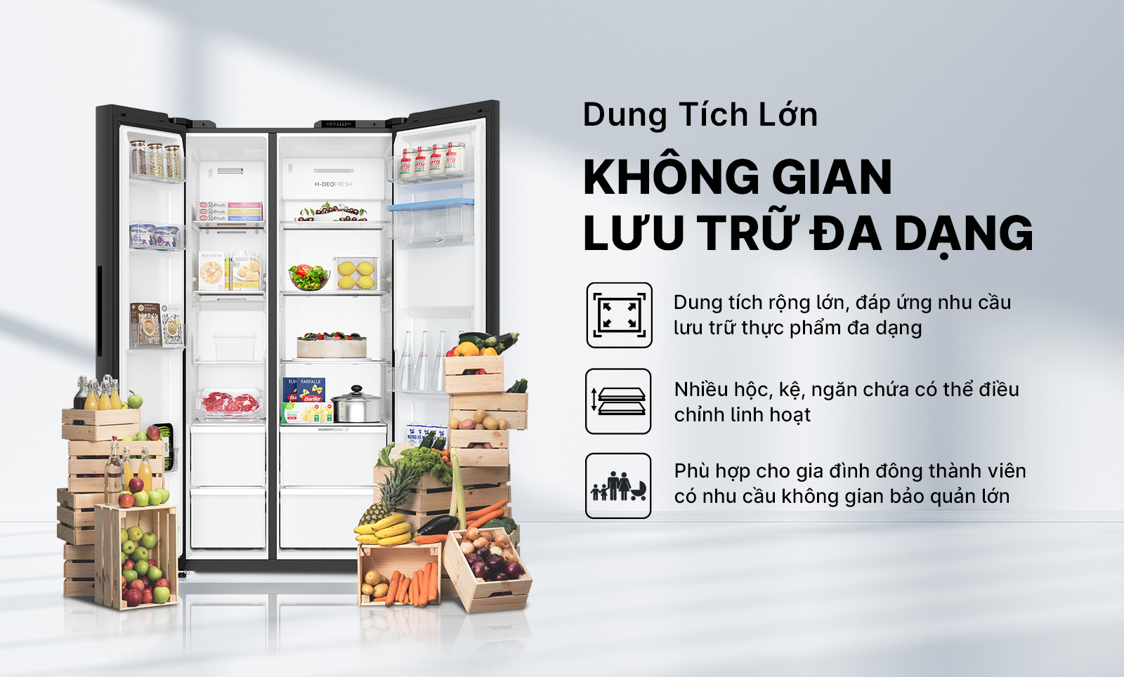 Một trong những điểm nổi bật của tủ lạnh Aqua AQR-S633XA(WSL) chính là thiết kế Side By Side hiện đại với hai cánh cửa mở rộng tiện lợi. Kiểu thiết kế này giúp người dùng dễ dàng quan sát và sắp xếp thực phẩm khoa học hơn so với những dòng tủ lạnh truyền thống. Đặc biệt, với dung tích lên đến 569 lít, sản phẩm này đáp ứng nhu cầu bảo quản thực phẩm cho những gia đình có trên 5 thành viên. Thêm vào đó, bên trong tủ được trang bị khay kính chịu lực, chịu được sức nặng lớn, thuận tiện sắp xếp thực phẩm đa dạng kích thước.