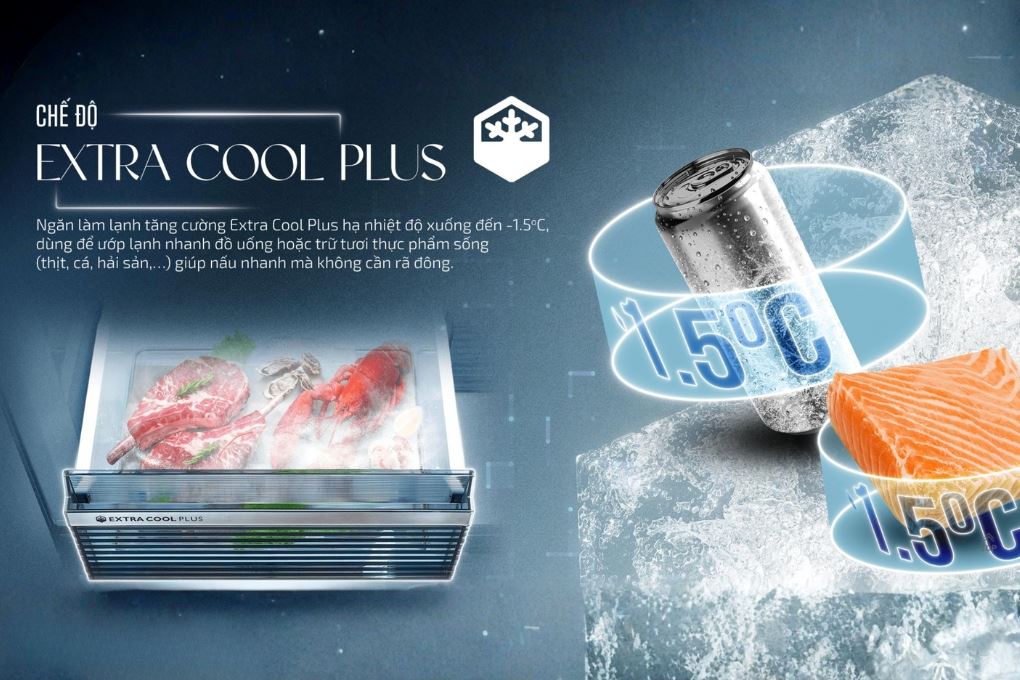 Bên cạnh dung tích lớn, tủ lạnh còn được trang bị hệ thống làm lạnh kép Hybrid Cooling phân phối khí lạnh đồng đều hơn, giúp nhiệt độ trong tủ ổn định, hạn chế hiện tượng chỗ quá lạnh, chỗ lại thiếu lạnh. Nhờ đó thực phẩm được bao quanh bởi luồng khí lạnh nhẹ nhàng, giảm thất thoát độ ẩm bề mặt.